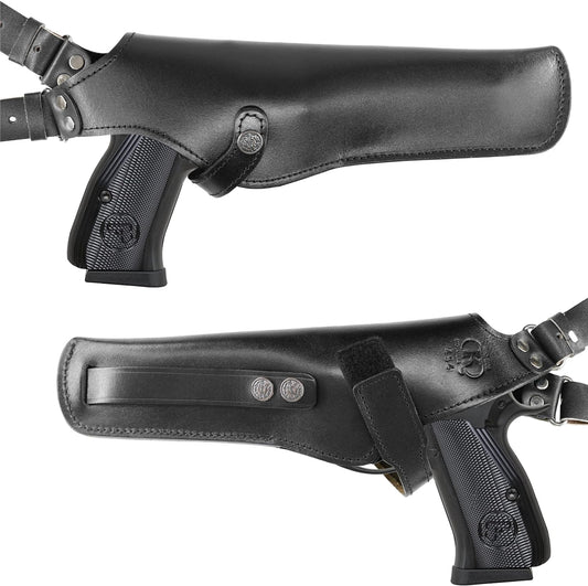 ALIS45206 Vertical Shoulder Leather Holster with Soft Fabric Interior Lining & Double Magazine Pouch Fits Beretta Taurus CZ 75 up to 5” Barrel Handmade!