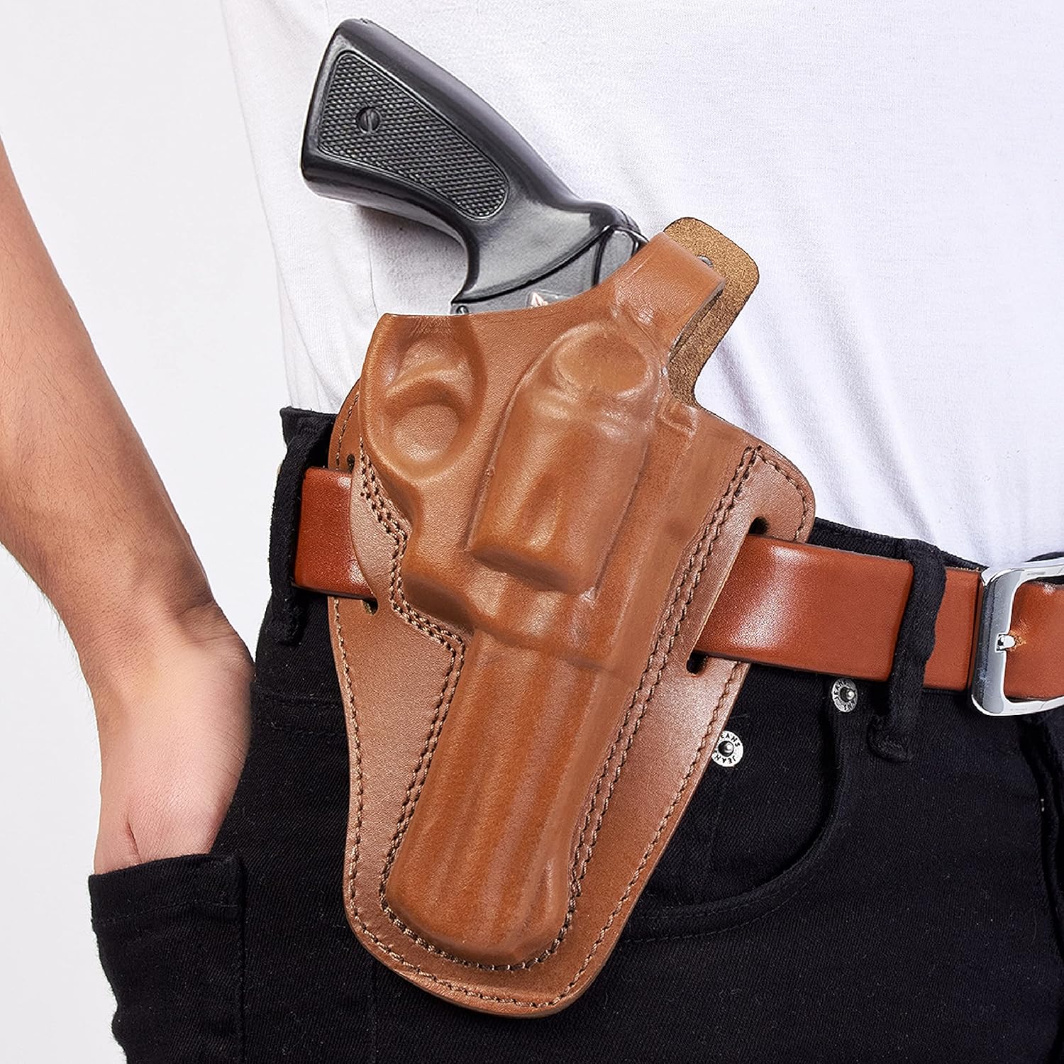 - Premium genuine cowhide leather belt retention holster excellent for open carry. The molded leather gives a snug fit with no rattle or movement.