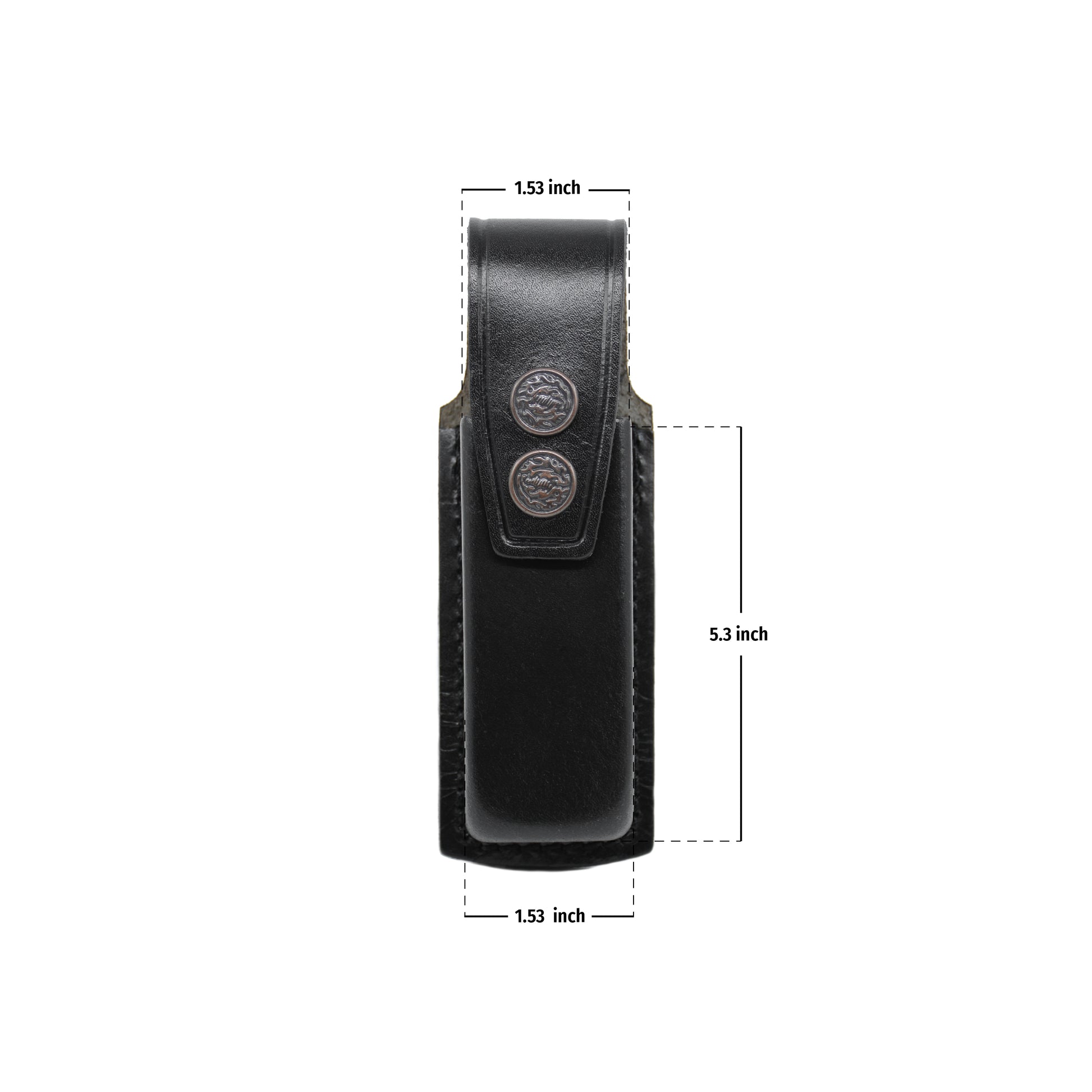 - Flap with snap keeps magazine securely in place. There is a button on the flap side to adjust for a longer mag.