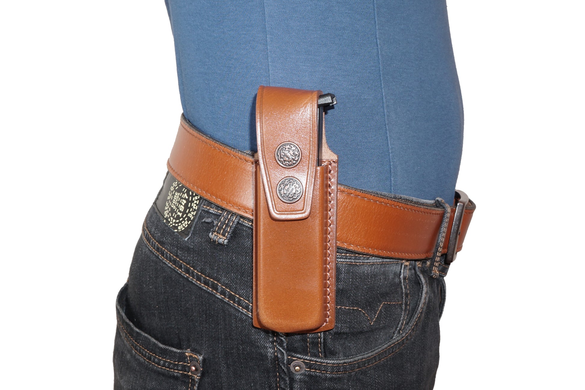 - High Quality Genuine Cowhide Leather with retention flap. Holds one magazine.