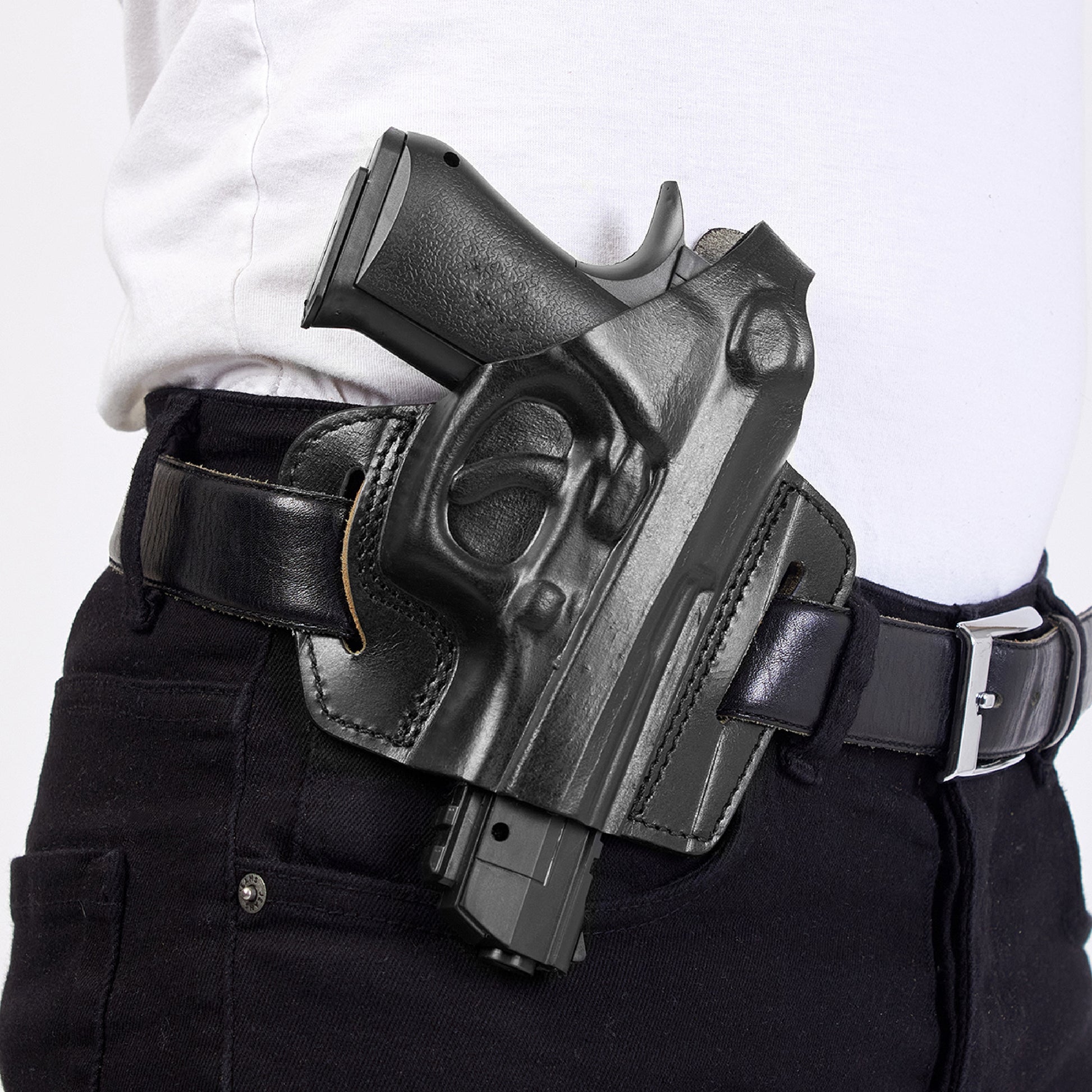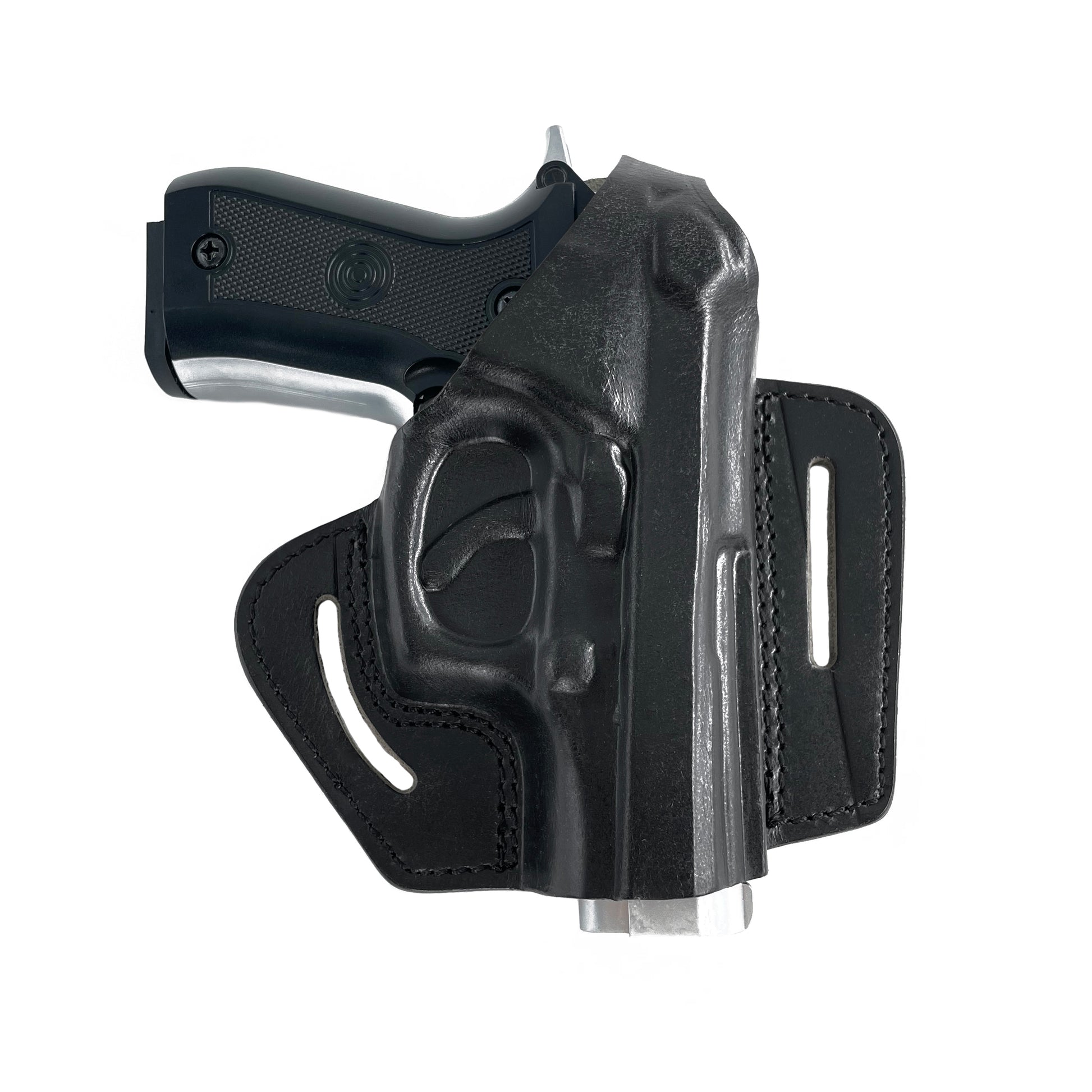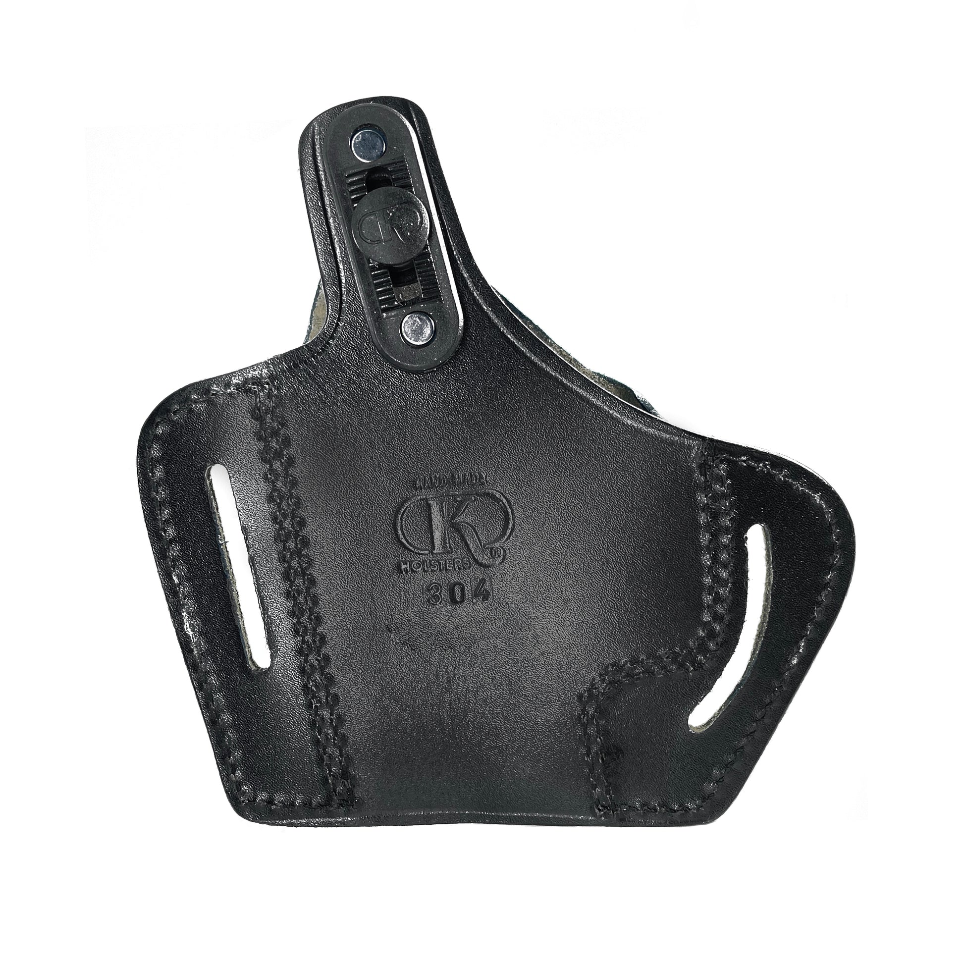 - The molded leather gives a snug fit with no rattle or movement. It is secured by looping your belt through the slots then tightening your belt. This pulls your pistol up close to your body providing a close fit.
