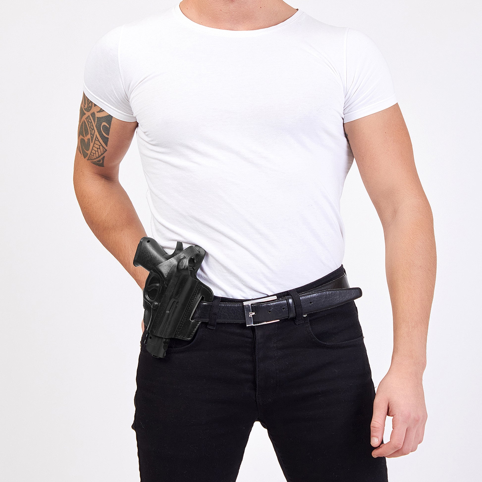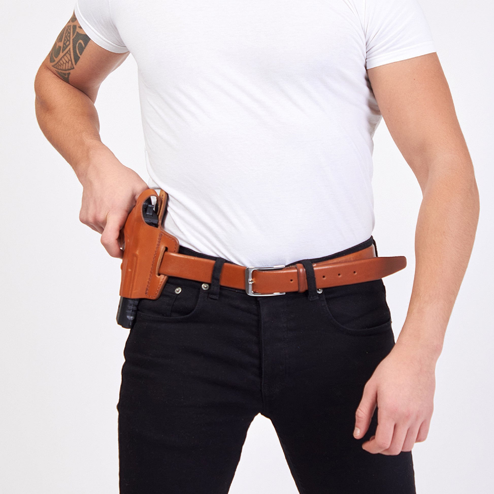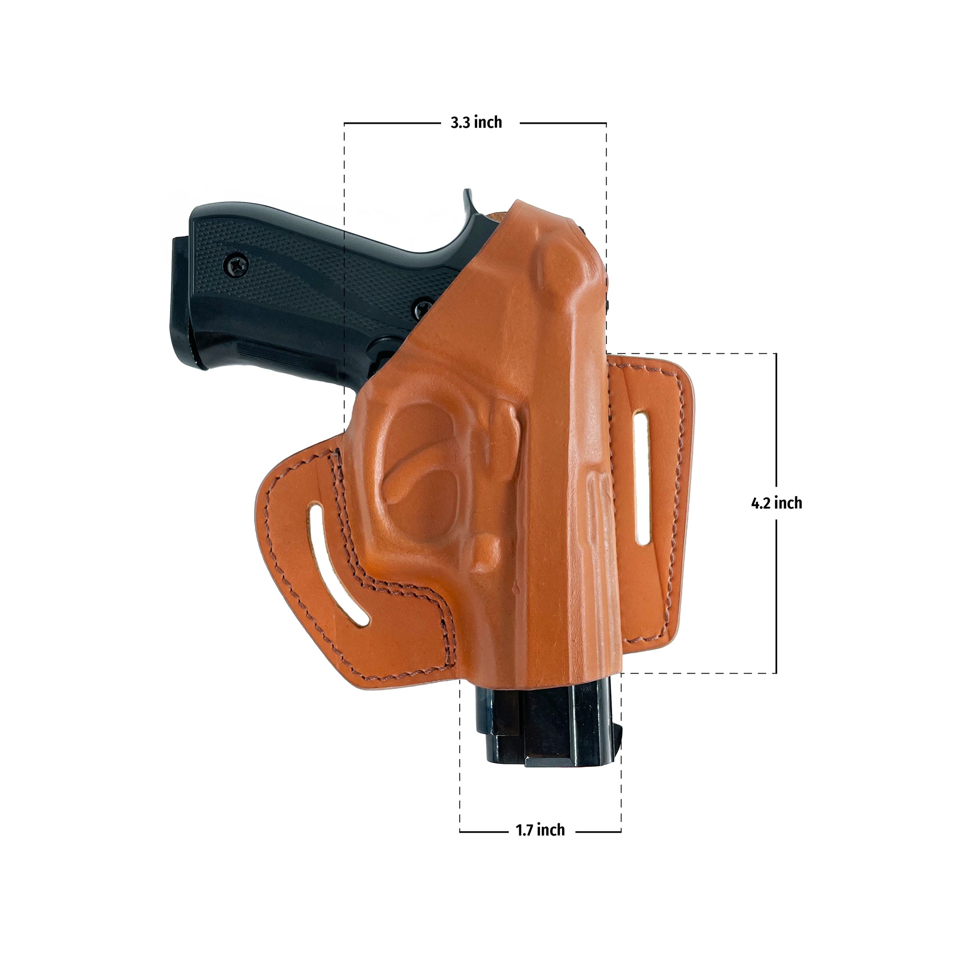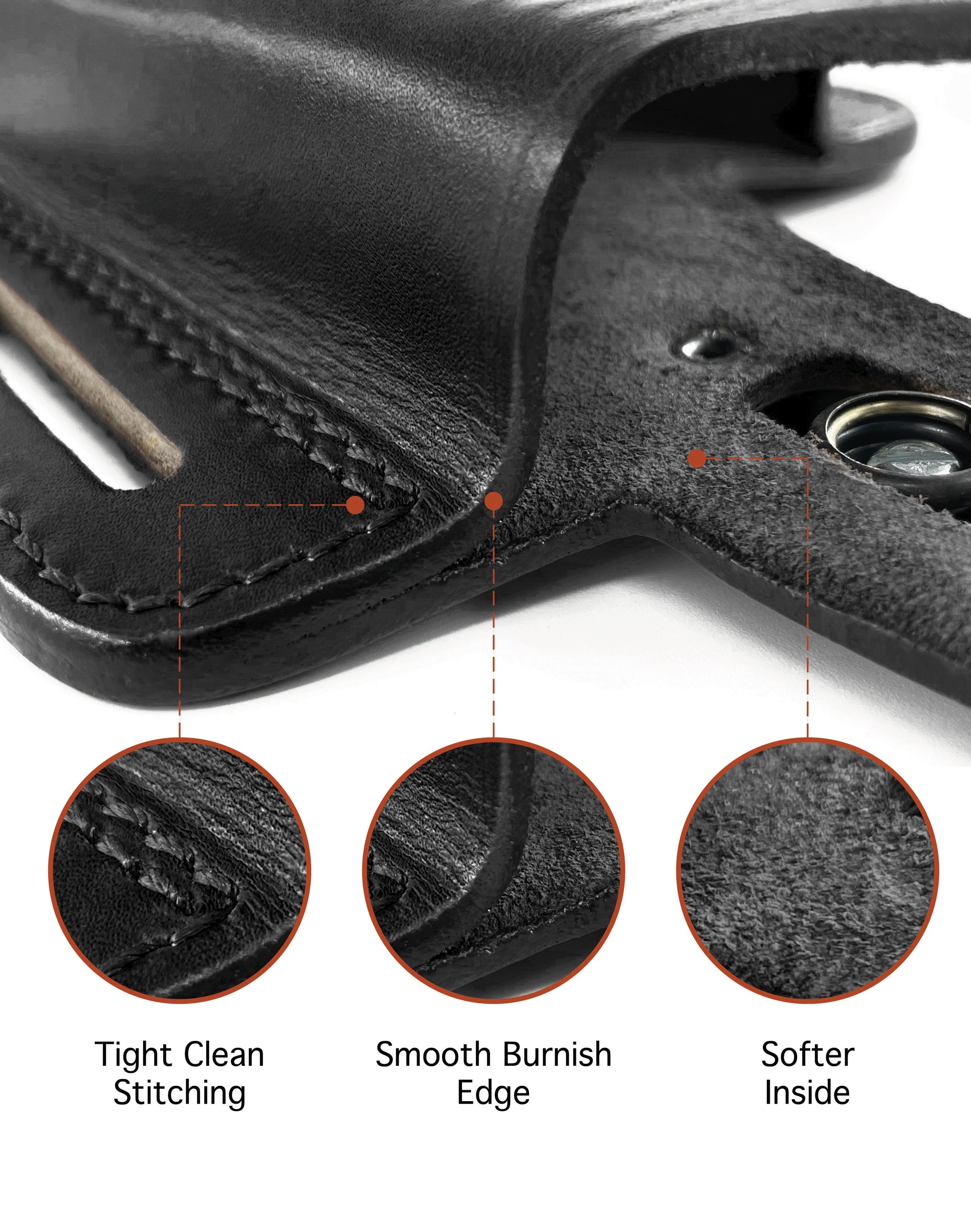 - The molded leather gives a snug fit with no rattle or movement. It is secured by looping your belt through the slots then tightening your belt. This pulls your pistol up close to your body providing a close fit.