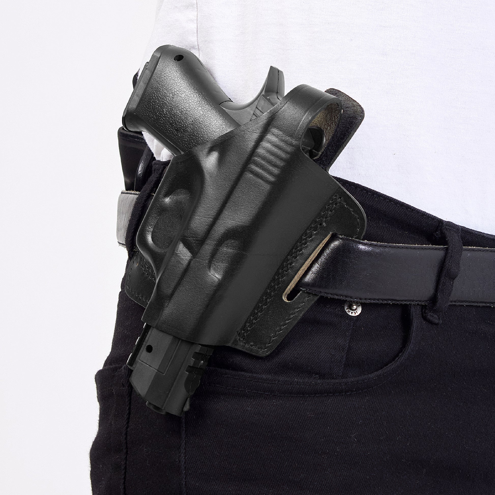 - Premium genuine cowhide leather belt retention holster excellent for open carry. ⦁ The molded leather gives a snug fit with no rattle or movement.