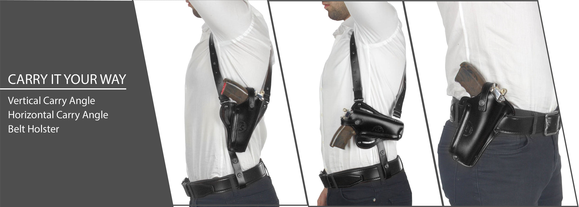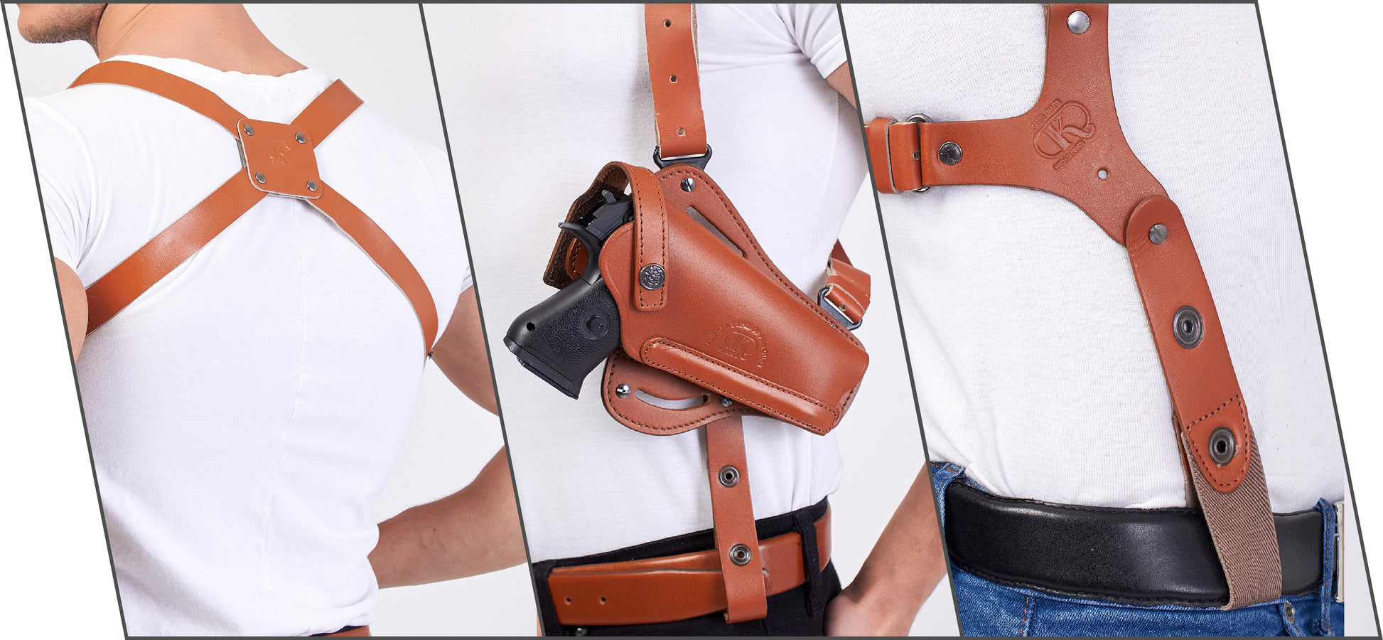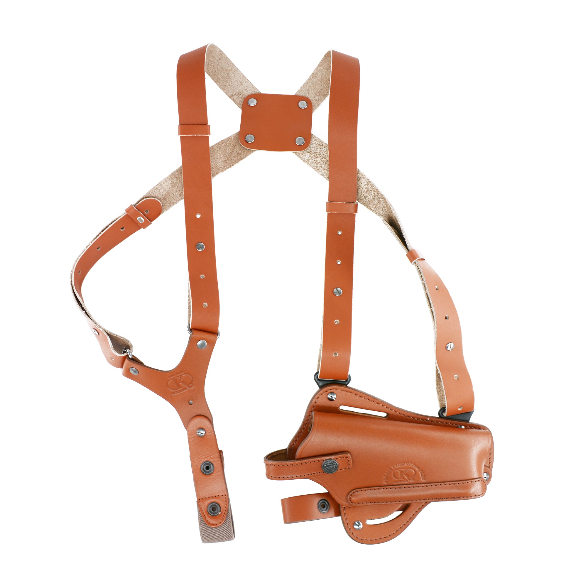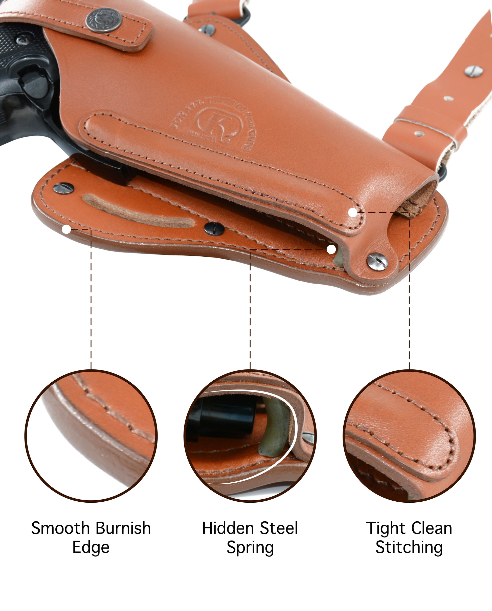 - The holster does have high grade double genuine leather, inside and outside leathers are genuine Hangs VERTICALLY & HORIZONTALLY under shoulder, can also be used as a BELT holster. Metal Spring hidden inside helps holster accommodates your gun very securely. Has a tunable /adjustable retention strap. Right Handed.