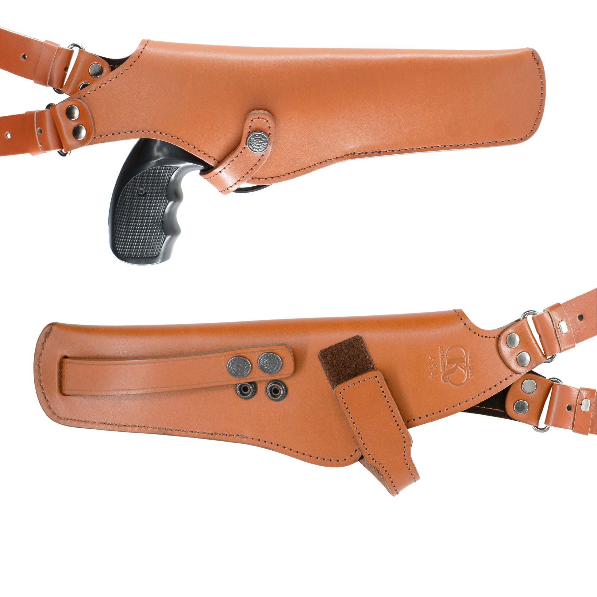 - Premium Cowhide Leather Shoulder Holster with very nice stitching and also with soft fabric interior lining. Hangs vertically under left shoulder for maximum concealment and comfort. Right Handed.