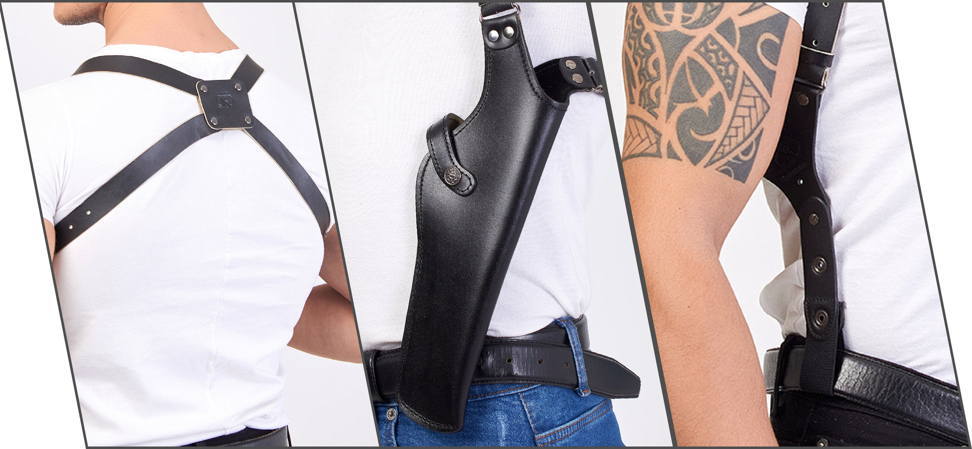 - Premium Cowhide Leather Shoulder Holster with very nice stitching and also with soft fabric interior lining. Hangs vertically under left shoulder for maximum concealment and comfort. Has a tunable/adjustable retention strap to keep gun securely. Right Handed.