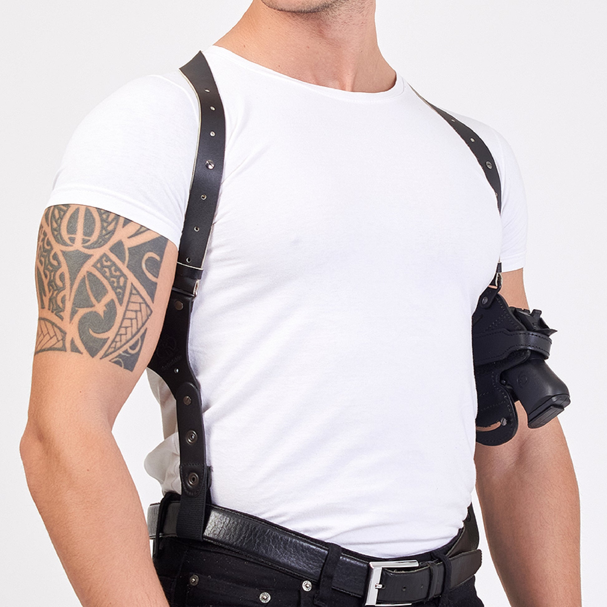 - Hangs HORIZONTALLY (as shown in the 1. Picture) and VERTICALLY (as shown in the 2. Picture) under shoulder, can also be used as a BELT holster (as shown in the 3. Picture) after taking the rigs off.