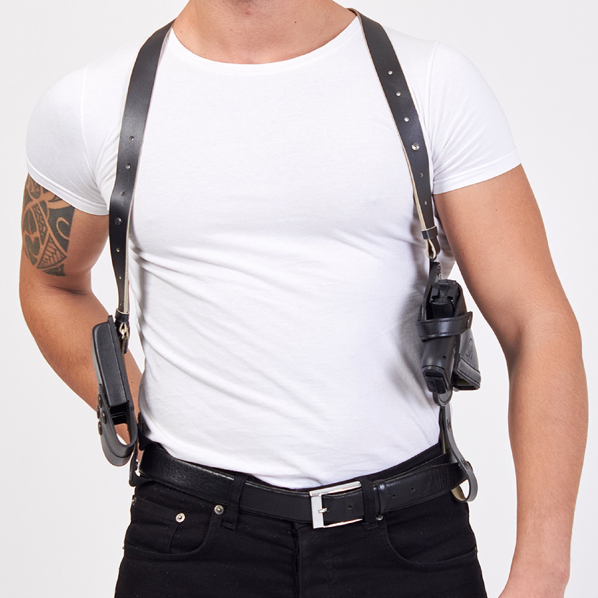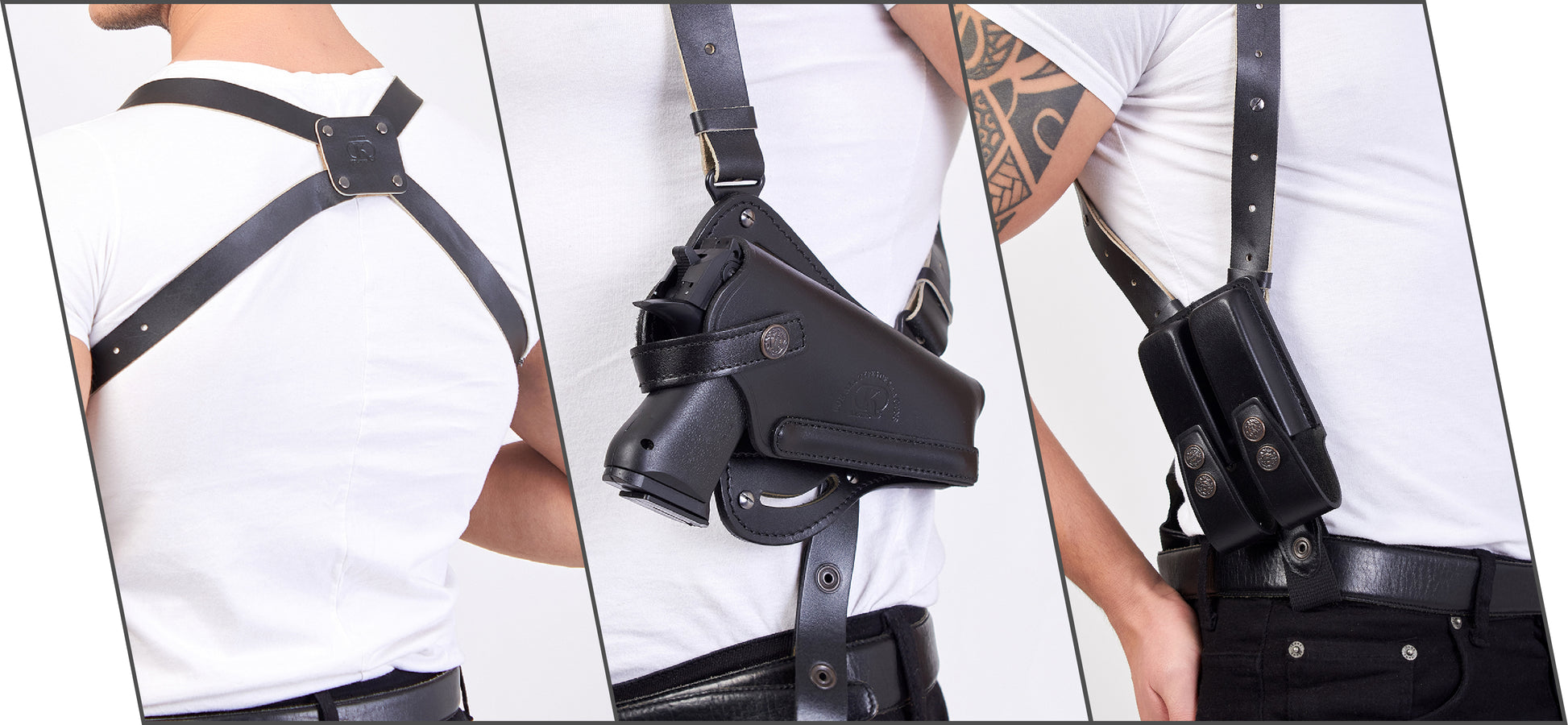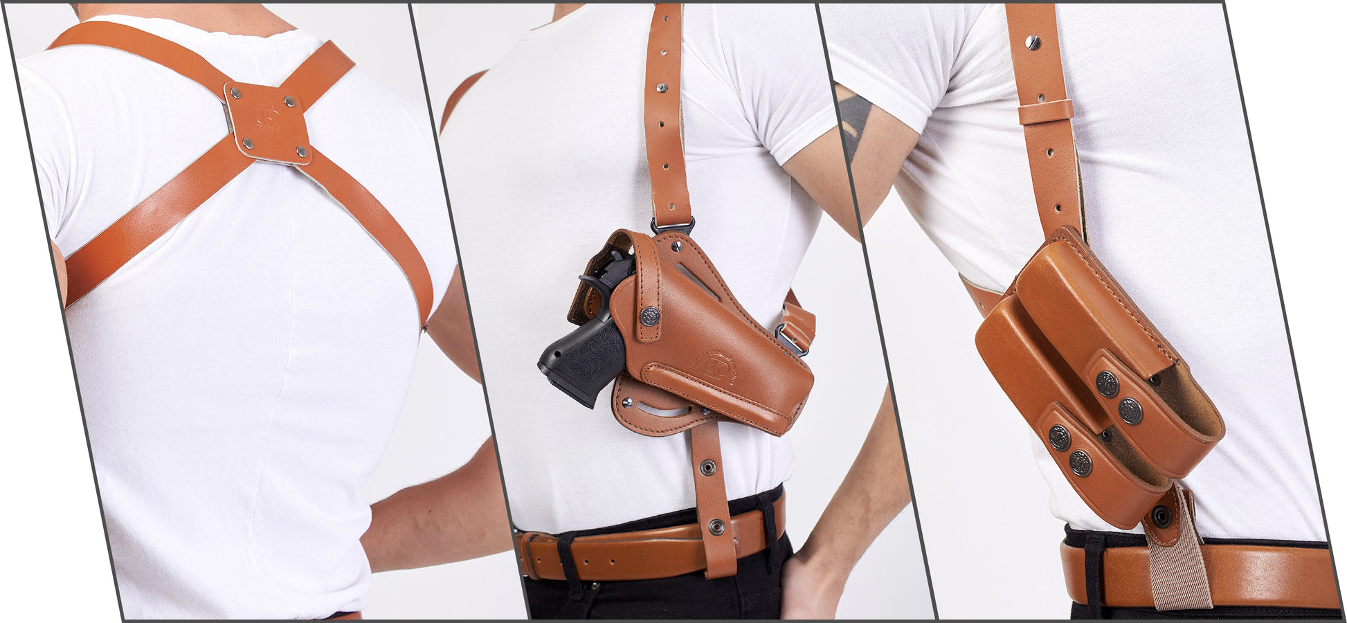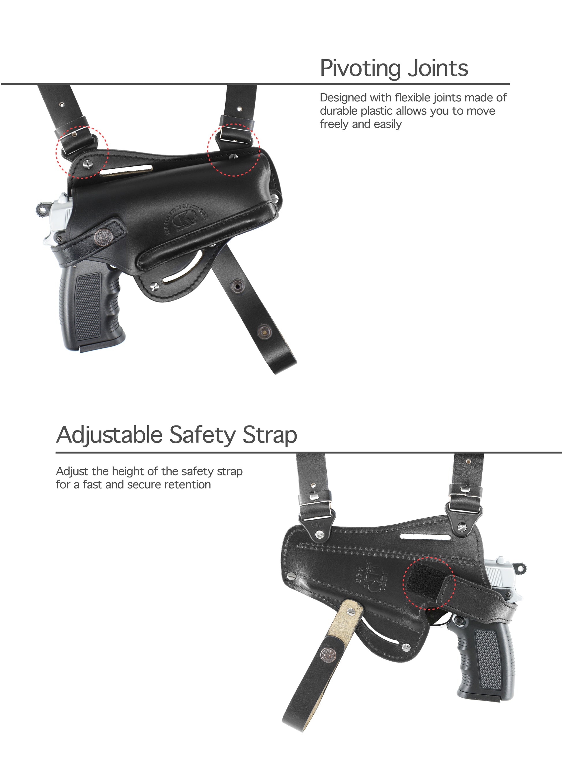 - Hangs VERTICALLY & HORIZONTALLY under shoulder, can also be used as a BELT holster.