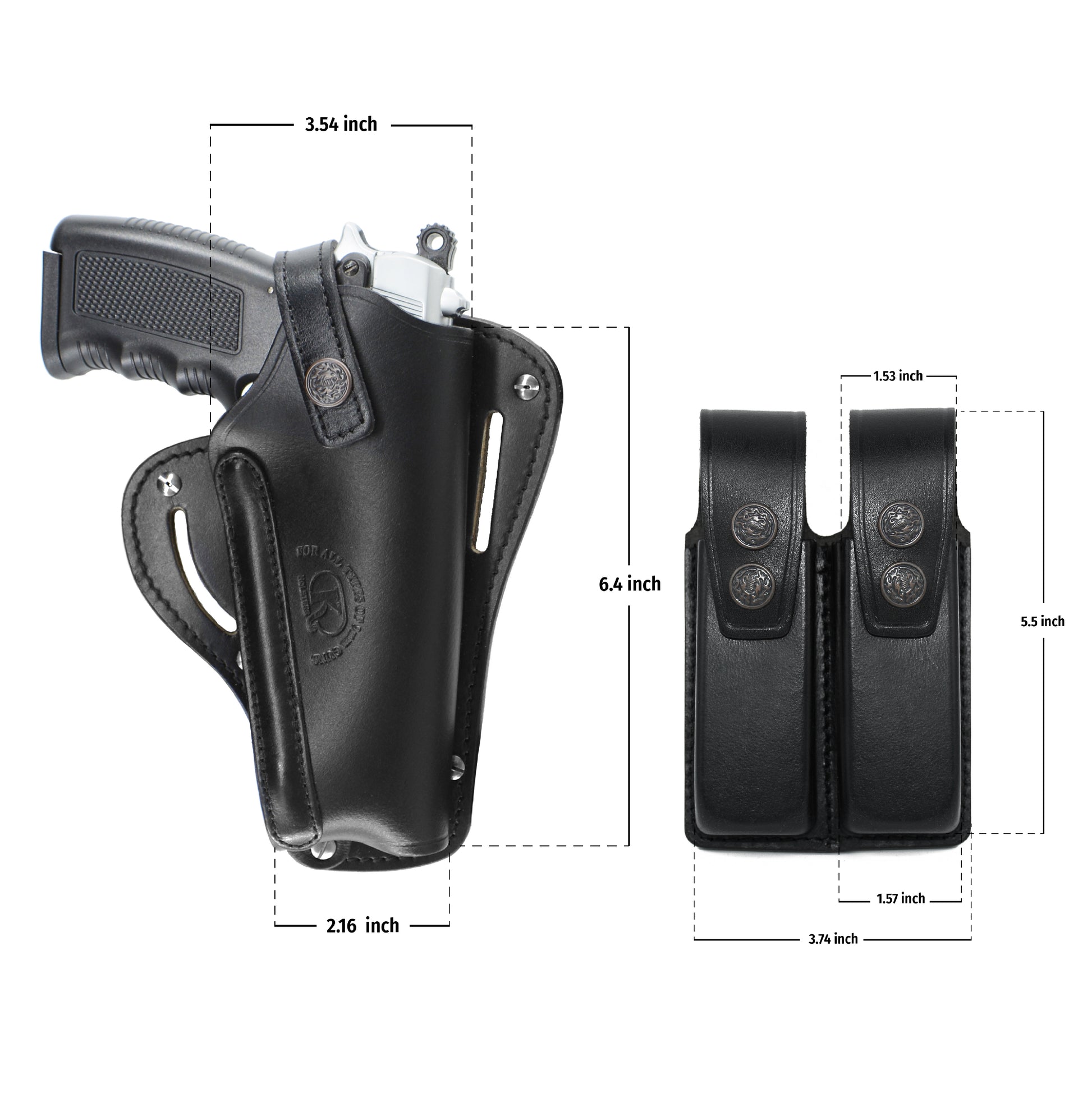- Double Mag Pouches hold two magazines upside down for easy access. Metal Spring hidden inside helps holster accommodates your gun very securely. Has a tunable / adjustable retention strap. Right Handed.