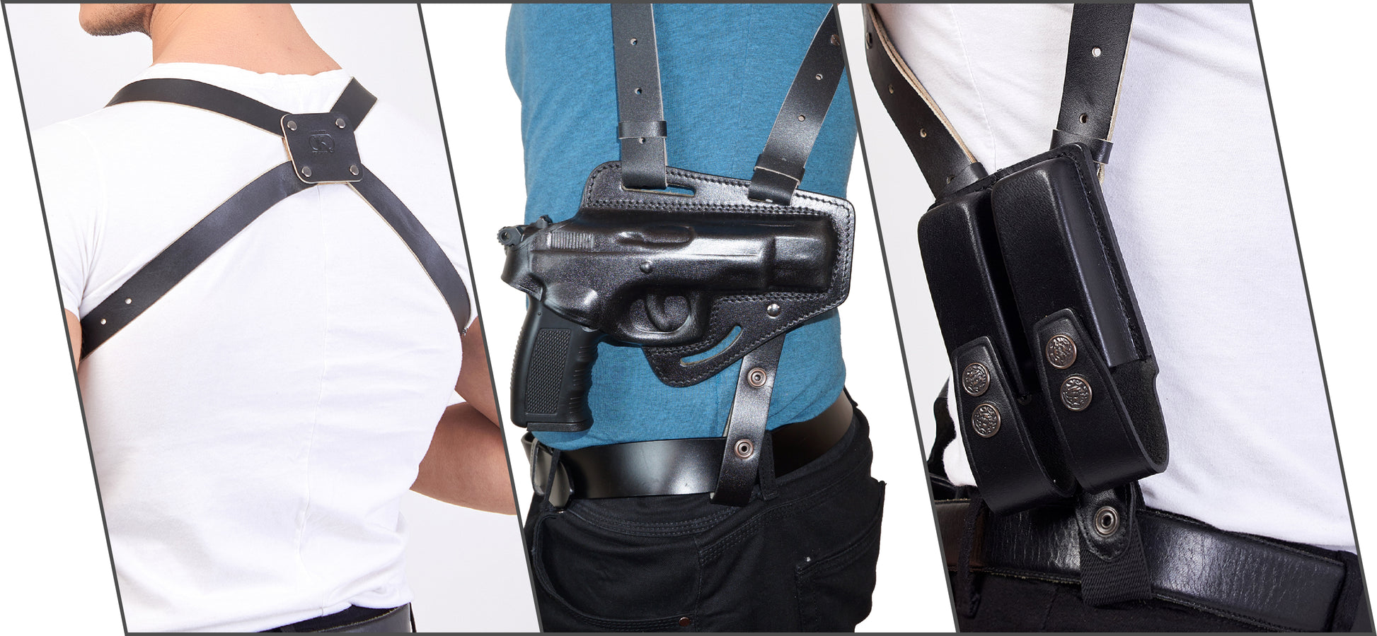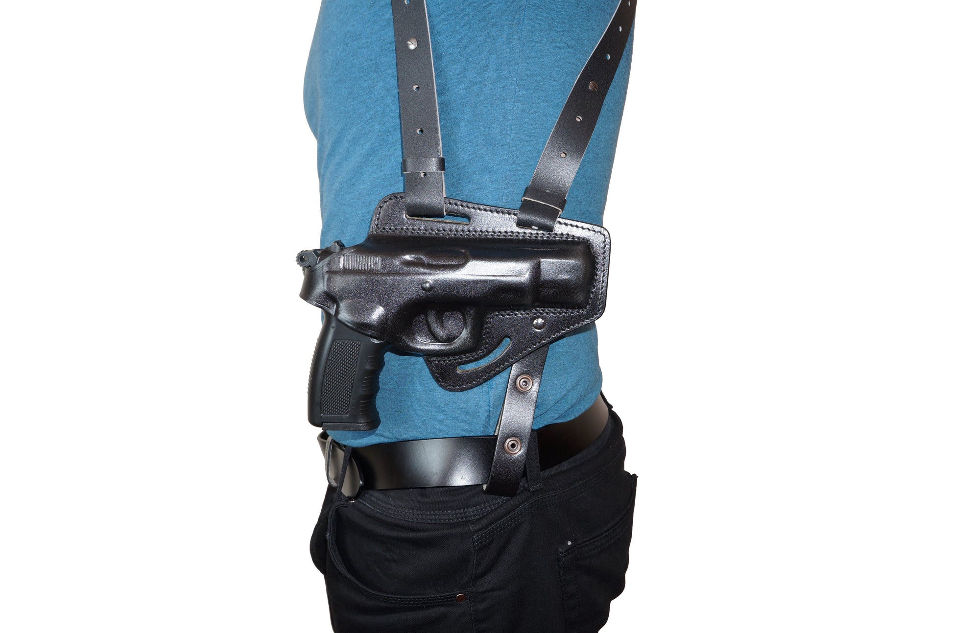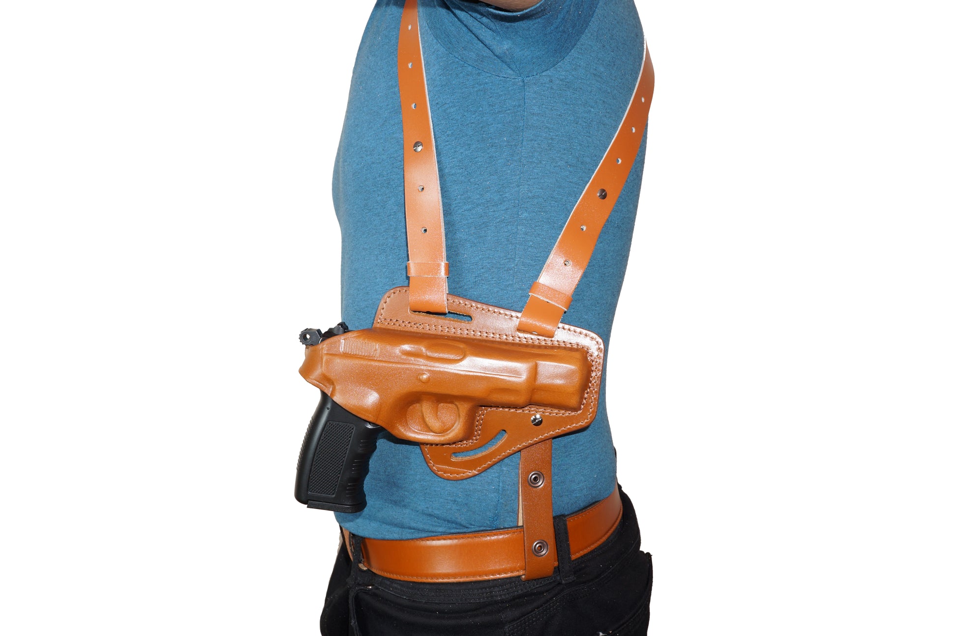 - Premium genuine cowhide leather. ⦁ Hangs HORIZONTALLY under shoulder, can be also used as BELT SLIDE holster after taking the rigs off (Picture 3). ⦁ The molded leather gives a snug fit with no rattle or movement. ⦁ It is secured by looping your belt through the slots then tightening your belt. This pulls your pistol up close to your body providing a close fit.
