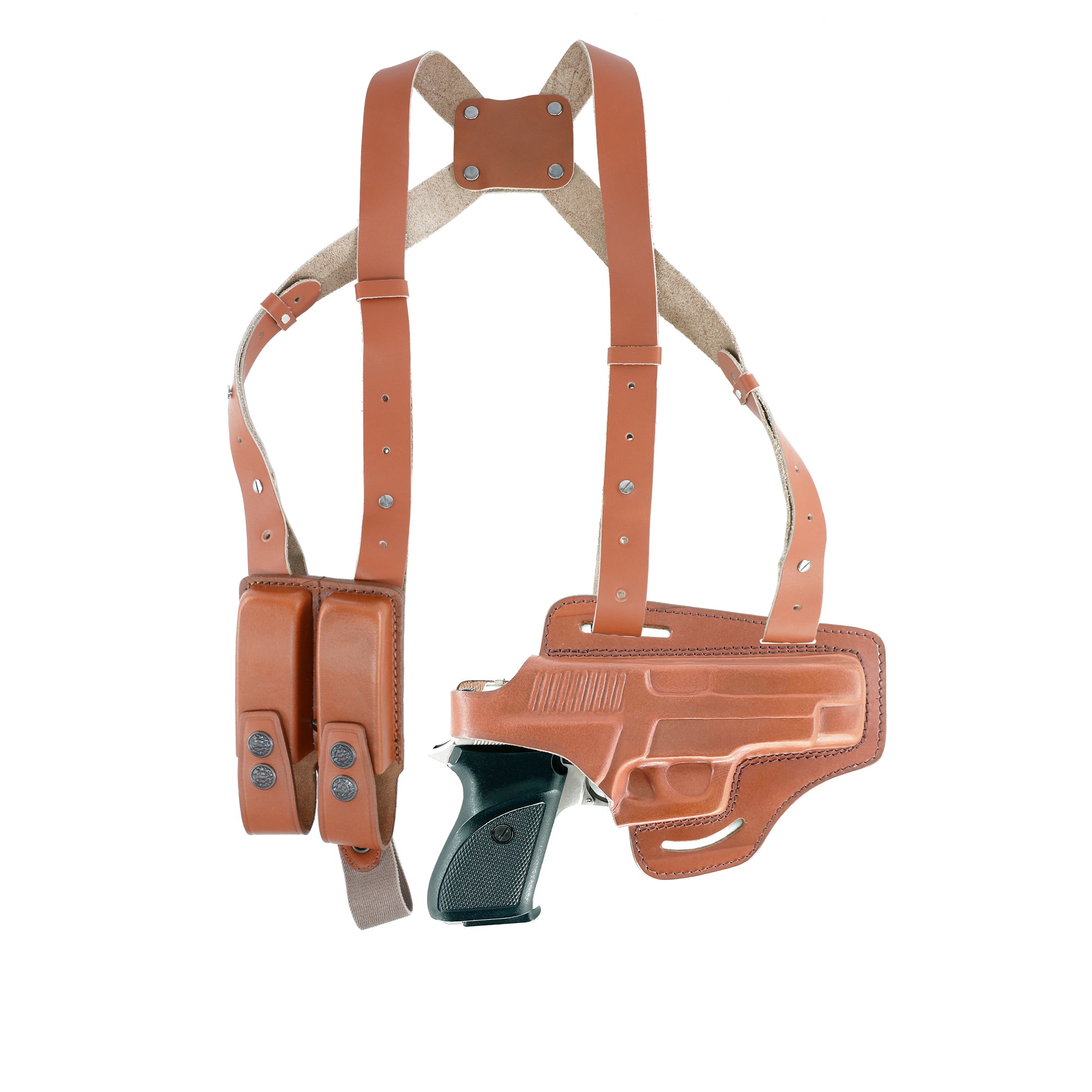 - Premium genuine cowhide leather. ⦁ Hangs horizontally under shoulder. Open-end. Right handed ⦁ Convertible; holster is very versatile as it can be worn as a horizontal shoulder holster or as a belt holster after taking the rigs off.