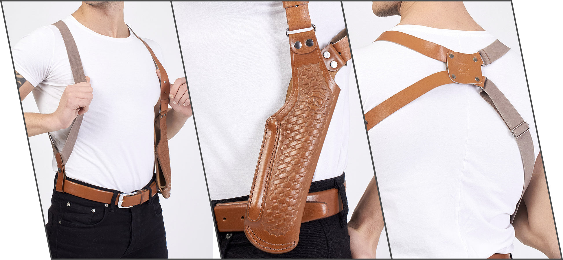 - Attractive basket weave pattern on premium cowhide leather. Metal Spring hidden inside helps holster accommodate your gun very securely.